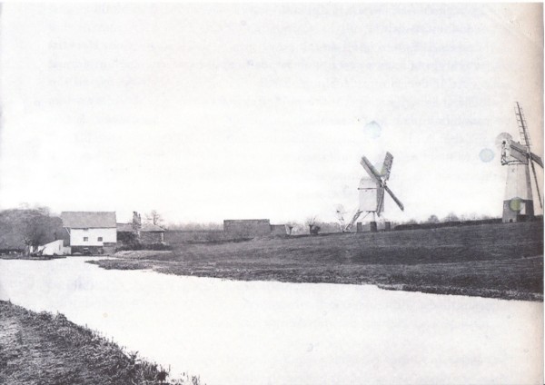 It is interesting that, in East Anglia, there was often a wind mill not very far from a water-mill, a good example is at Pakenham. It appears that one supported the other when a drought occurred, and Fornham St. Martin was no exception. Sadly there is no evidence on the ground now, but the attached copy of a photograph taken in about 1875 shows very clearly two windmills, fairly close together at the top of the meadow behind Wentworth Close and within a few metres of the public foot path. Fortunately their precise location can be seen as “crop-marks” on the Google earth map, an aerial photograph taken in the summer a year or so ago.