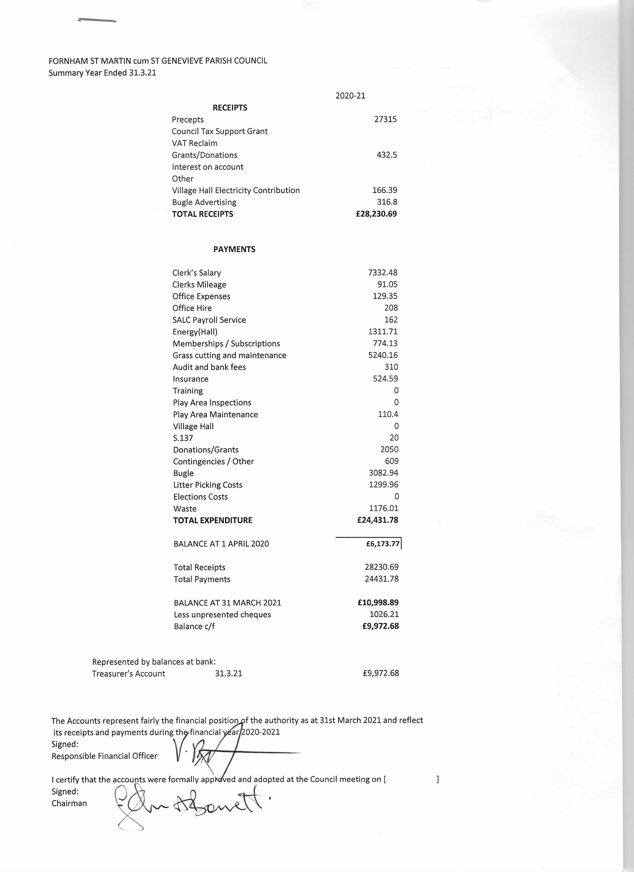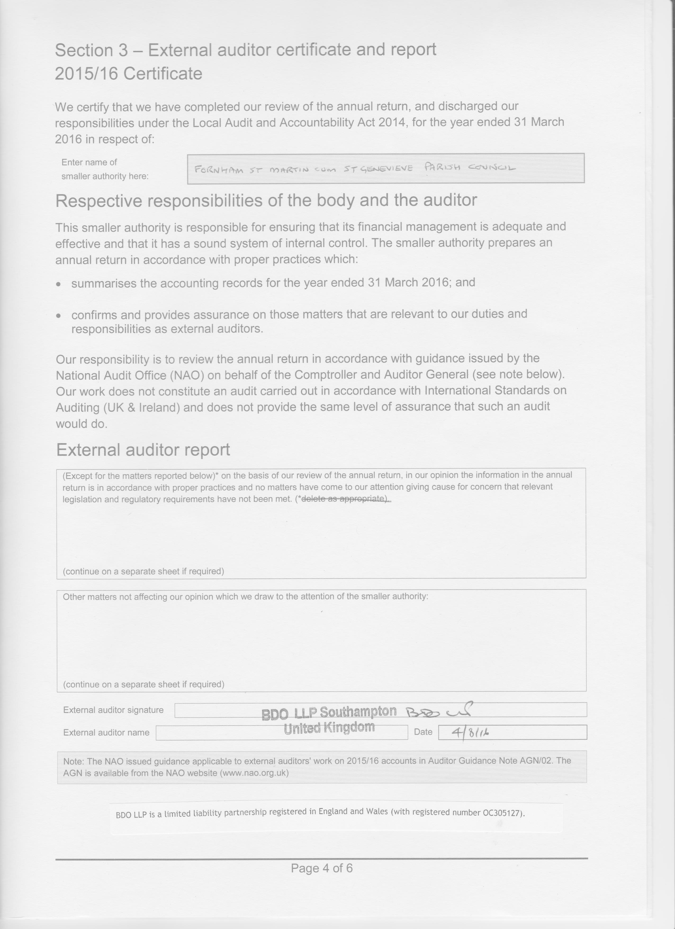 • the end of year accounts, annual governance statement and internal audit report as contained in the Annual Return (usually available following the Parish Council meeting in May)
